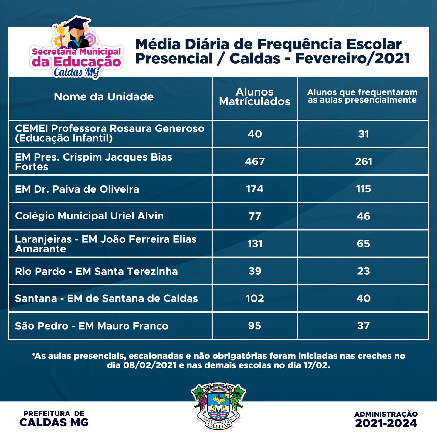 A Prefeitura de Caldas divulgou nessa semana a média de atendimento presencial às aulas em fevereiro, quando o município retomou as aulas de maneira híbrida, ou seja, aulas ministradas pela internet, para os alunos em casa, e na escola, em dias escalonados da semana.