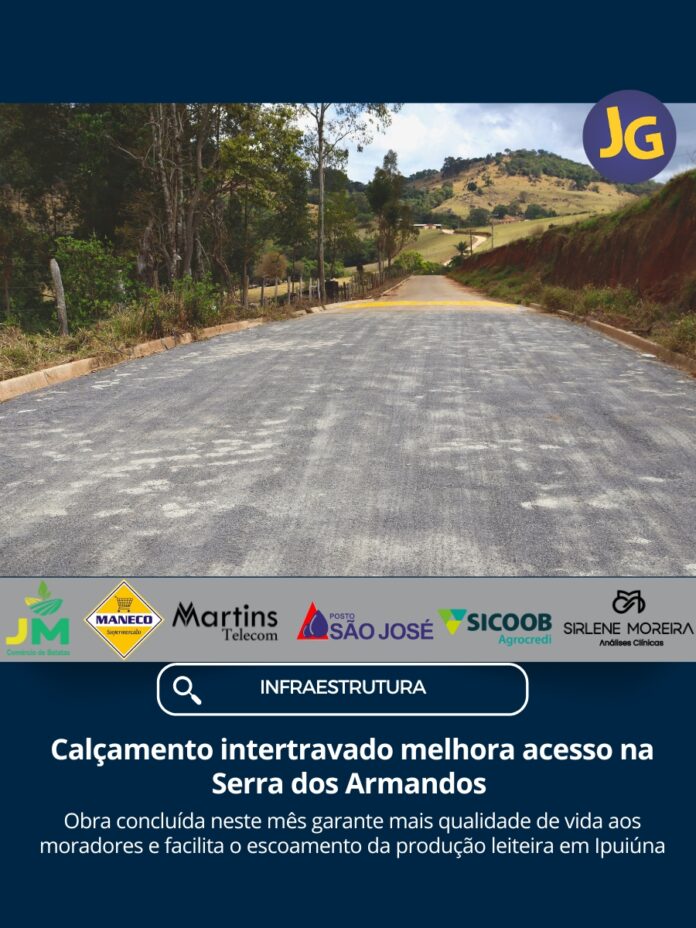Foi concluído neste mês o calçamento de 1,2 km de estrada rural na Serra dos Armandos, em Ipuiúna. A obra, realizada com bloquetes intertravados e largura de 6,5 metros, beneficia diretamente os moradores da comunidade e os produtores rurais que dependem da via para o escoamento de sua produção, especialmente a de leite, que é uma das principais atividades econômicas da região.