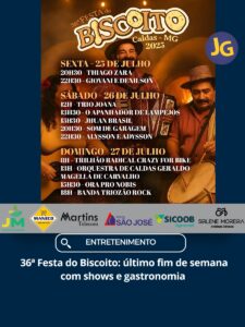 Em Caldas, a Festa do Biscoito movimentou o Balneário de Pocinhos do Rio Verde durante todo o mês, atraindo turistas e moradores para shows, comidas típicas e atividades culturais. Agora, nos dias 25, 26 e 27 de julho, acontece o último final de semana da festa, que contará com apresentações imperdíveis como Thiago Zara, Giovani e Denilson, Trio Joana, Alysson e Adysson, Orquestra de Caldas Geraldo Magella de Carvalho e muito mais.Além da música, o Trilhão Radical Crazy for Bike agita a programação de domingo, unindo esporte e aventura.