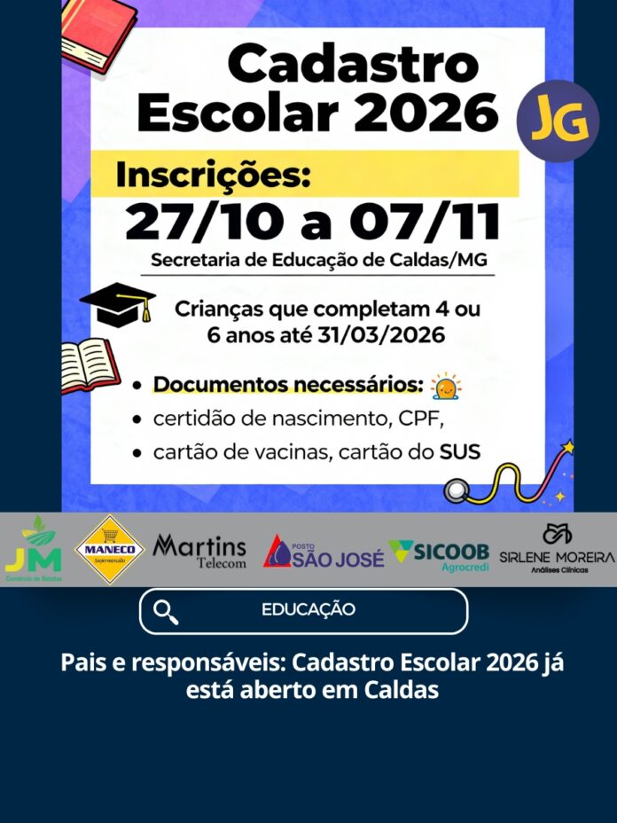 A Secretaria Municipal de Educação de Caldas informa que as inscrições para o Cadastro Escolar 2026 estarão abertas de 27 de outubro a 7 de novembro, das 7h às 16h, diretamente na Secretaria.