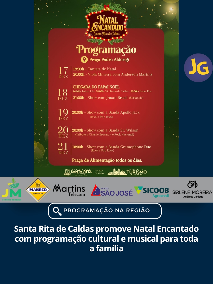 A agenda inclui cantata de Natal, viola mineira, sertanejo, rock e pop rock, além de atrações para toda a família. A praça de alimentação funciona todos os dias, garantindo lazer e convivência para a população e visitantes.