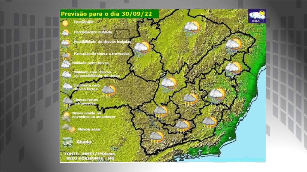 Nesta sexta-feira, áreas de instabilidade favorecem a ocorrência de pancadas de chuva isoladas em Minas Gerais. Os índices de umidade ficam mais elevados em relação aos últimos dias. A temperatura máxima prevista no estado é de 35oC no extremo Norte do estado. No fim de semana, há condições de chuvas isoladas em parte do estado de Minas Gerais e a temperatura ficará em ligeira elevação, inclusive na capital e Grande Belo Horizonte. Aqui na região sul ela cai um pouquinho, não passando dos 23°.