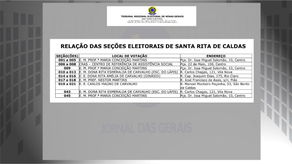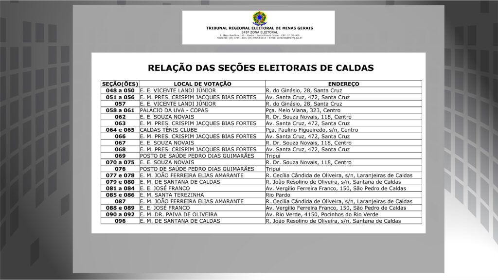 Dentro da 345ª eleitoral, que compreende as cidades de Caldas, Ipuiuna e STa Rita de Caldas, a gente te mostra onde.
