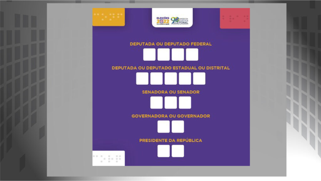 A ordem de votação será a seguinte: deputado federal, (4 números) deputado estadual (5 números) ou distrital, senador (3 números) , governador (dois) e presidente da República também 2 números.