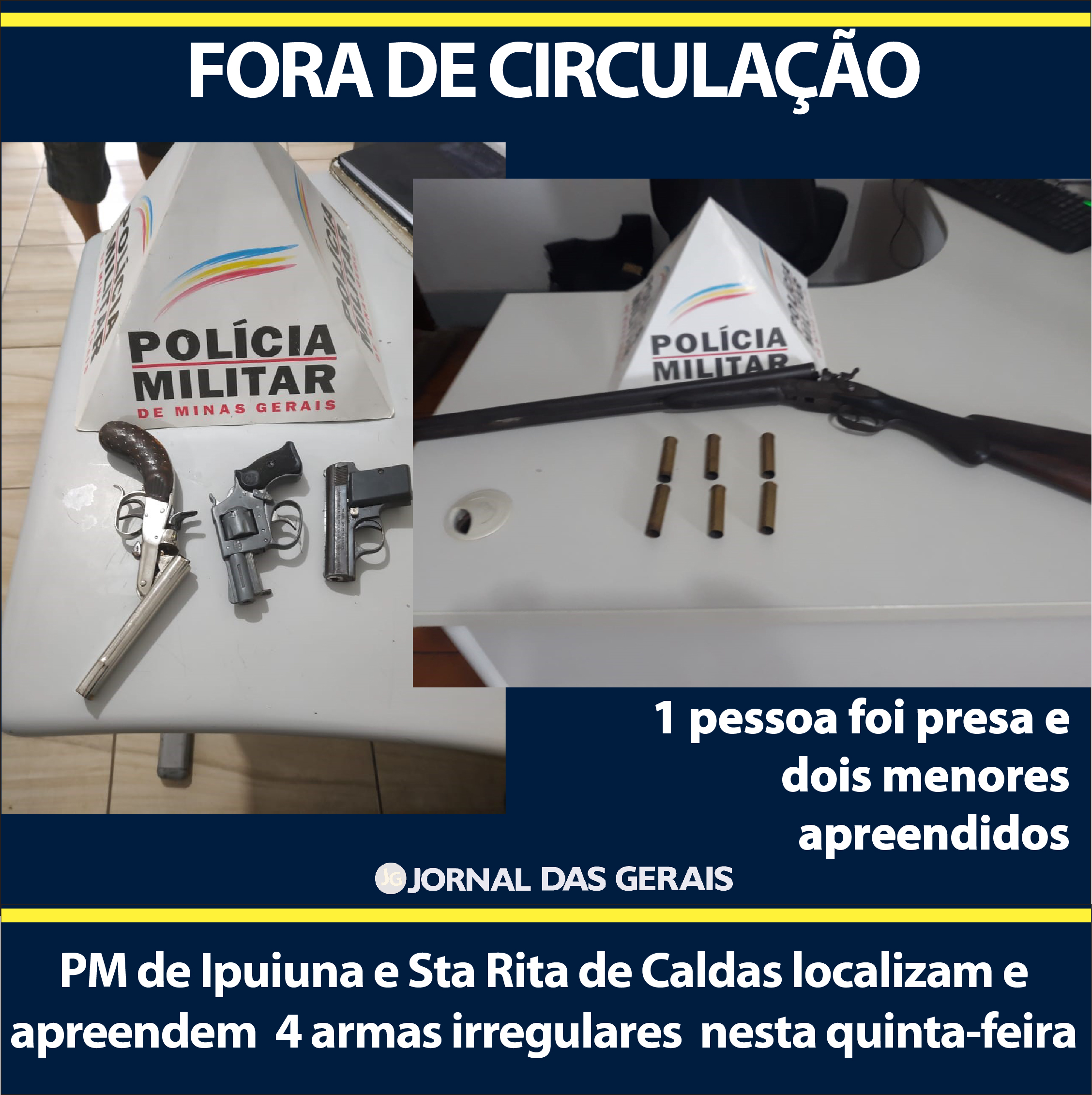 Já em Santa Rita de Caldas, três armas de fogo também foram apreendidas. Informações obtidas pela Polícia relatavam que dois menores estavam de posse de tais armas. Os militares conseguiram localizar e apreender os infratores, menores envolvidos com furtos, e apreenderam também as armas, sendo uma pistola, um revólver e uma garrucha.