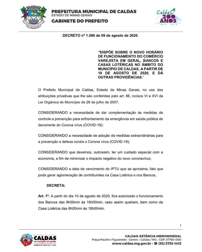 A partir dessa segunda feira, 10 de agosto de 2020, a prefeitura de Caldas autorizou o funcionamento das agências bancárias do município para o horário das 9hs às 16hs, bem como da Casa Lotérica das 8hs às 18hs. Anteriormente, em função da pandemia do novo Covid-19, esse horário tinha sido alterado, reduzindo o atendimento ao público. Caberá à agencia optar pelo novo horário ou não.