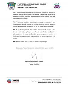 Prefeitura de Caldas autoriza novo horário de funcionamento do comércio, bancos e casas lotéricas do município